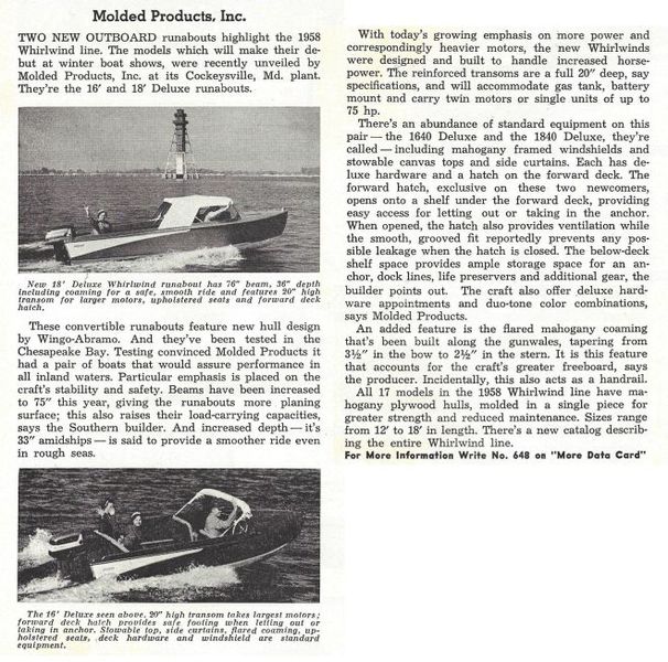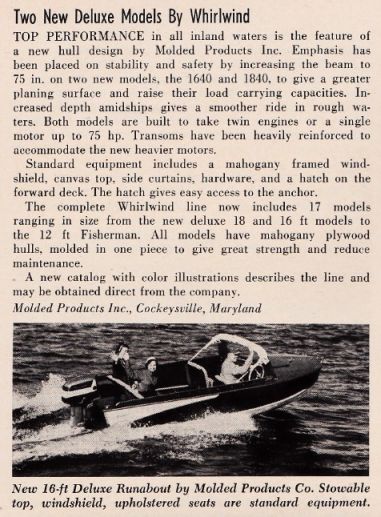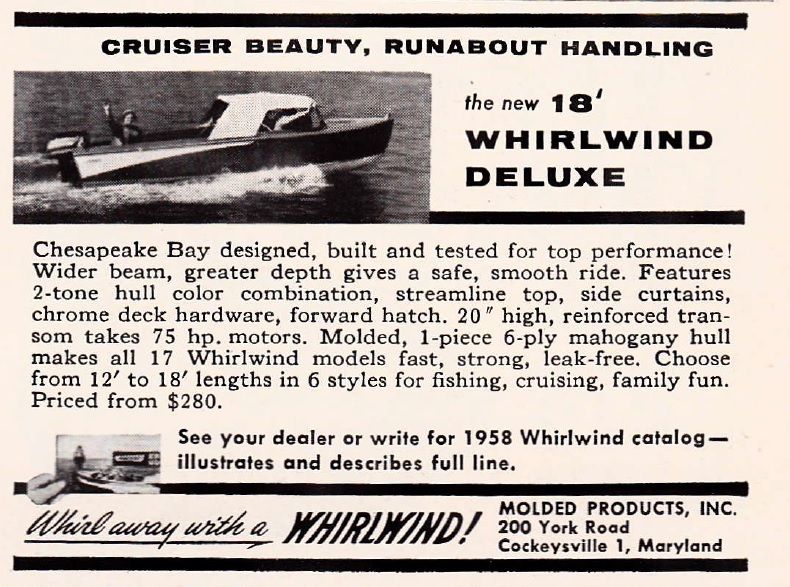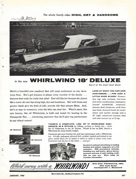 The Whirlwind line of outboard runabouts, produced by Molded Products, Inc. of Cockeysville, Maryland, gained prominence in the late 1950s for its innovative design and family-friendly features. The 1958 lineup introduced two standout models—the 16′ and 18′ Deluxe runabouts—which debuted at winter boat shows and were tested in the challenging waters of Chesapeake Bay to ensure top performance in all inland conditions. These boats were designed by Wingo-Abramo and emphasized stability, safety, and dry riding comfort, making them ideal for family use.